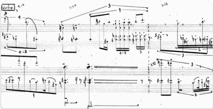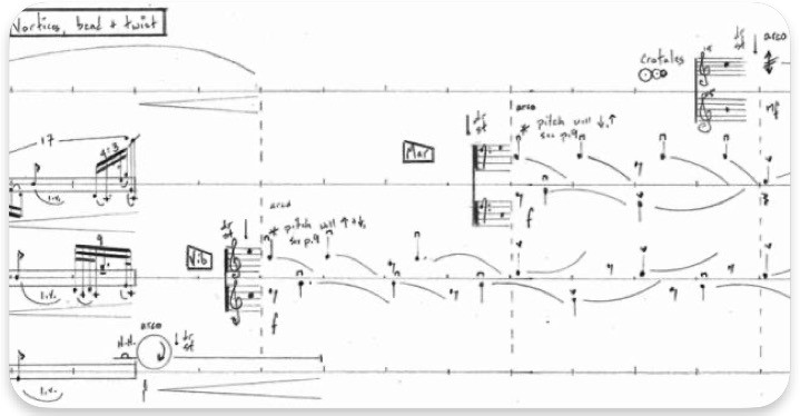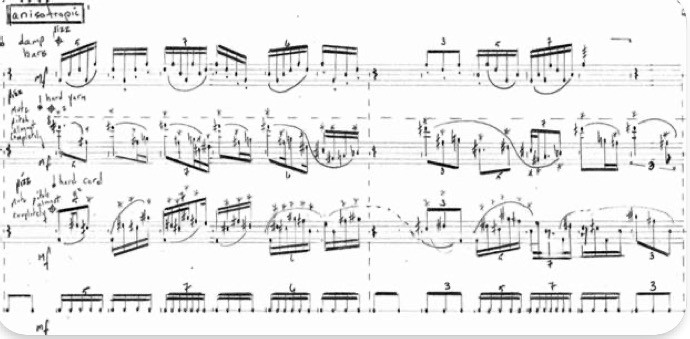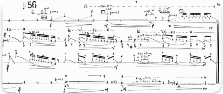 Scored for vibraphone and marimba, each with supplemental metal or wood sticks, these vortices produced the most complicated pitch and rhythmic structures in the entire piece (see fig. 14 and sound 3).