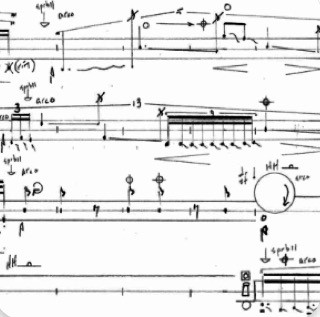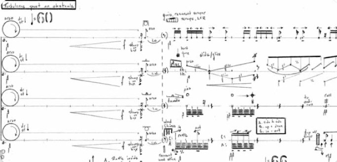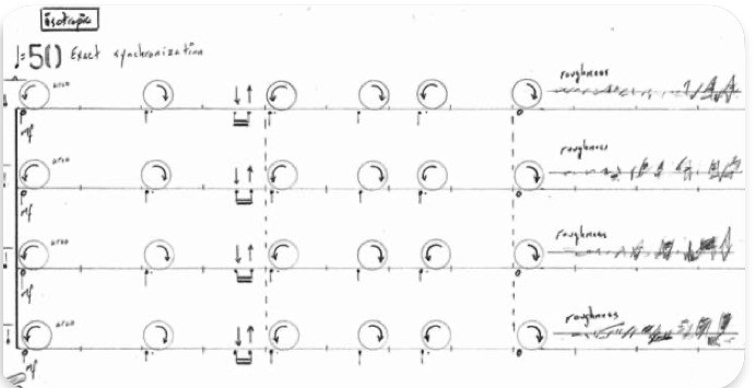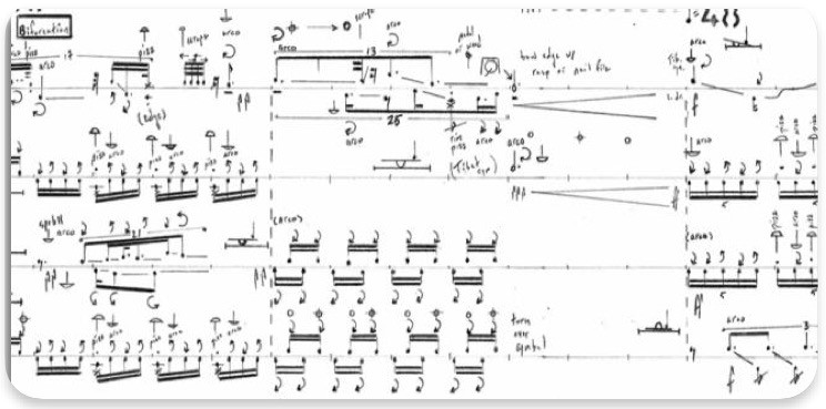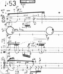 In this material, superfluid is represented by arco-rub on handheld cymbals, while normal fluid is represented by rhythmically active pizz and arco gestures on the other instruments. Representing friction, I’ve asked the performers to produce timbral changes to the arco rub motions on the handheld cymbals (see fig. 20 and sound 8).