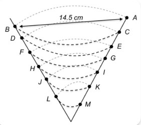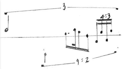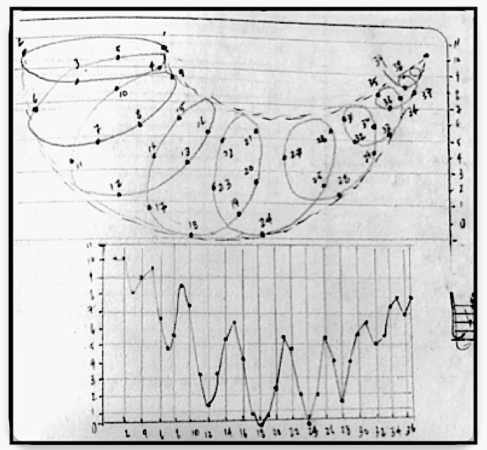 Table 1 shows a nonserial matrix of integers used to generate non-determinative rhythms. These numbers were derived from the physical distance between nodes of a vortex. The measurements were taken at a descending series of nodes, for example the distance between point A and point B equaled 14.5 cm; while the distance between point B and point C equaled 13.8 cm, etc. In total there were 17 points, producing 16 lengths (see fig 15). In order to build in variation and develop scaling that would allow for intuitive control, I transposed this initial integer series downward, so that there were 21 integer series in total.