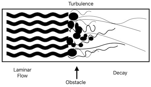 (7) TURBULENCE, PAST AN OBSTACLE. In normal fluid, turbulence often occurs past an obstacle, like large boulders in a rapids, in the manner of eddies, whirlpools and all manner of vortices. Turbulence decays downstream of the obstacle (see fig. 9).