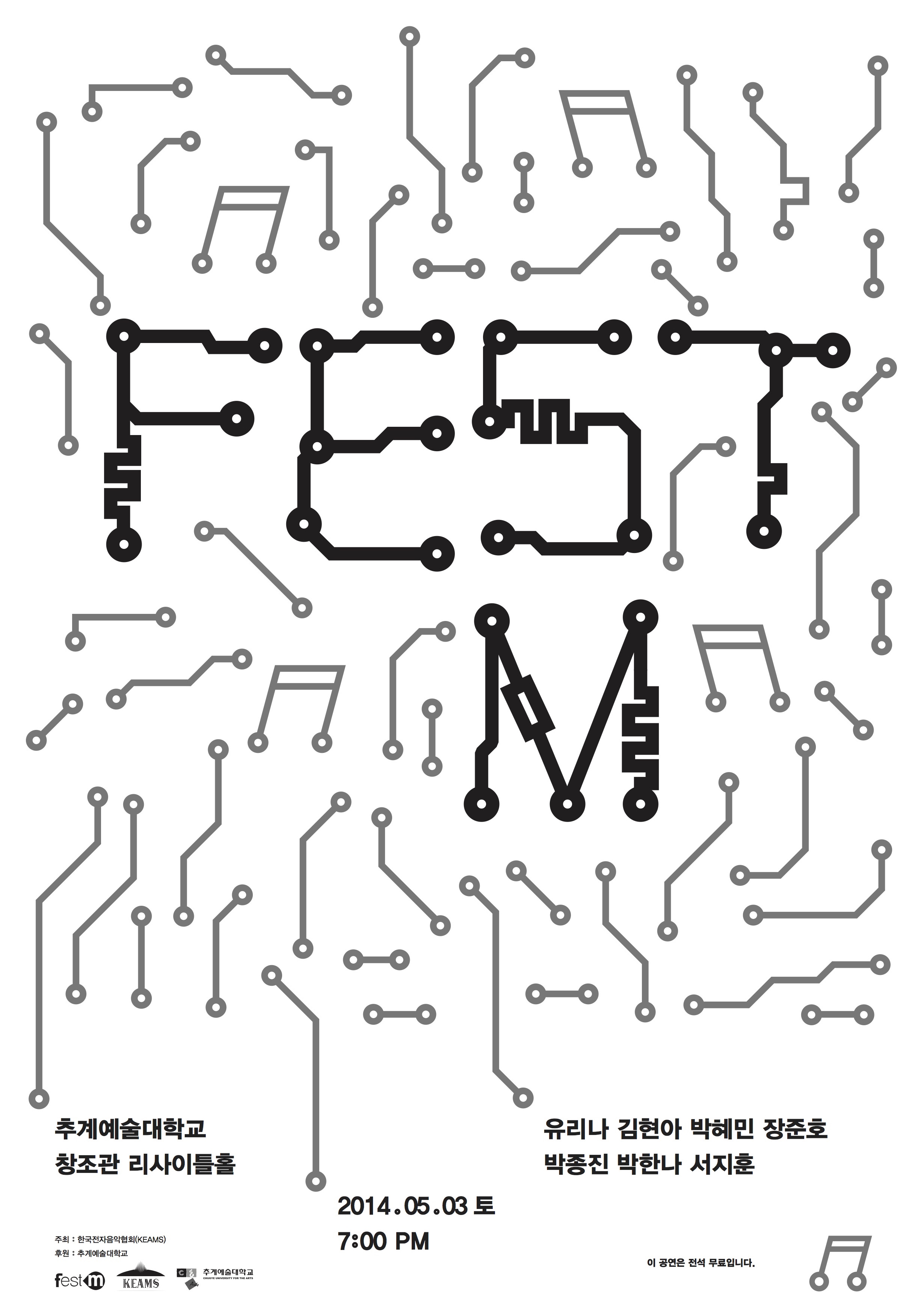fest-m은 젊고 개성있는 작곡가들의 컴퓨터음악이 공연되는 축제입니다. fest-m은 한국전자음악협회가 주최하고 (주)미디랜드가 후원해오고 있으며 매년 공모를 통해 선정된 작품이 연주됩니다.